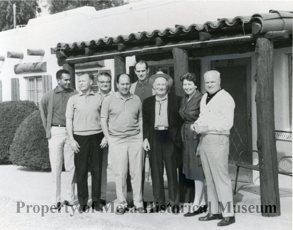 A group of people posing outside the Buckhorn Baths Motel; Ted and Alice Sliger are pictured.