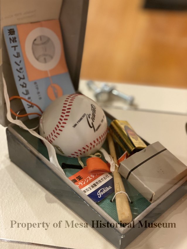 Transitor radio in the shape of a baseball, from Japan. Keychain is attached to one end of the baseball. SF Giants.