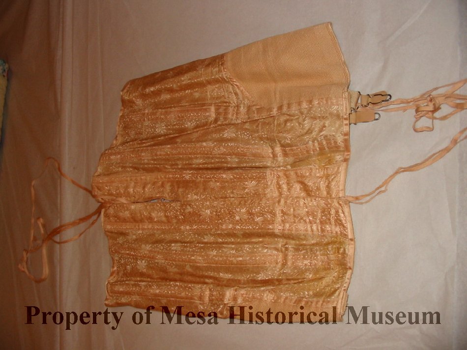 Peach colored lace up corset with flowered design. Has attachments for hosery