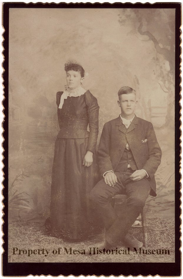 Wedding portrait in sepia-tone: young brunette-haired woman in long black skirt and long-sleeved black jack with white decorative collar; young light-haired man in dark suit, white shirt, sitting on chair to her left.