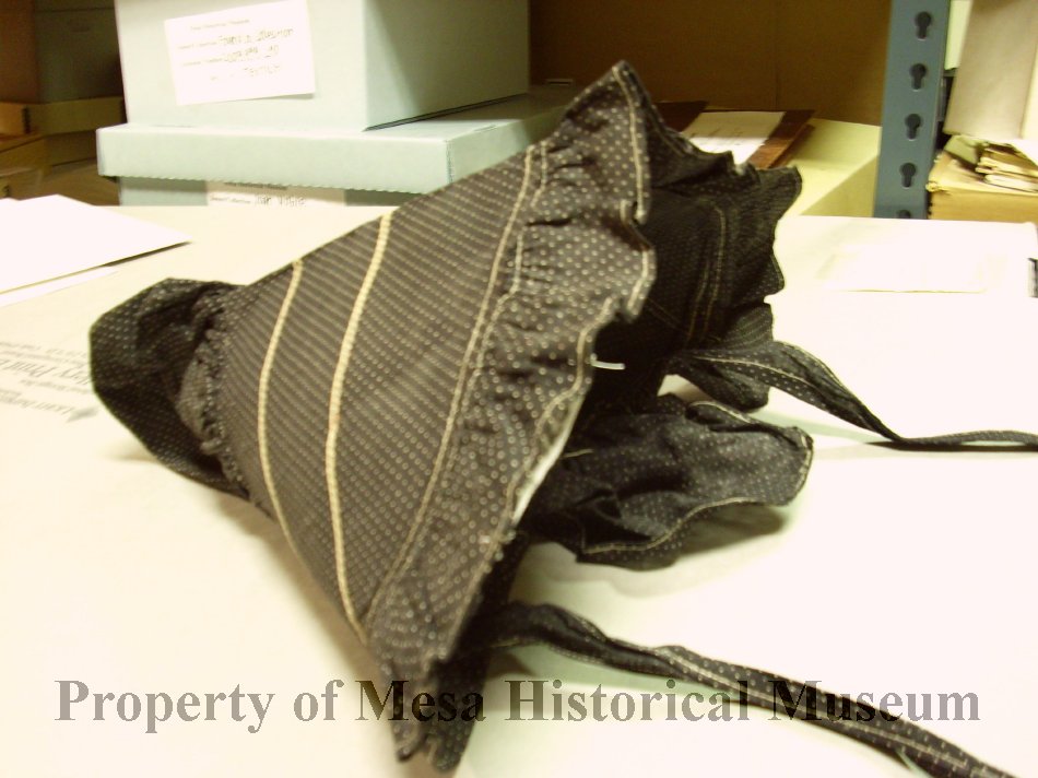Black with tiny white dots sewn with tan/white thread. Stiffened cotton. Wide brim with a 1 1/2" ruffle. Brim has two rows of decorative stitching. Crown is gathered around topo and ends with a flap to cover neck. There is a string gathering the flap at neckline and fabric ties tied into a bow on back neck flap. Bonnet has two fabric ties to hold it on the head. 14" length from front of brim to back of crown. 9" brim. 15" across back of crown.