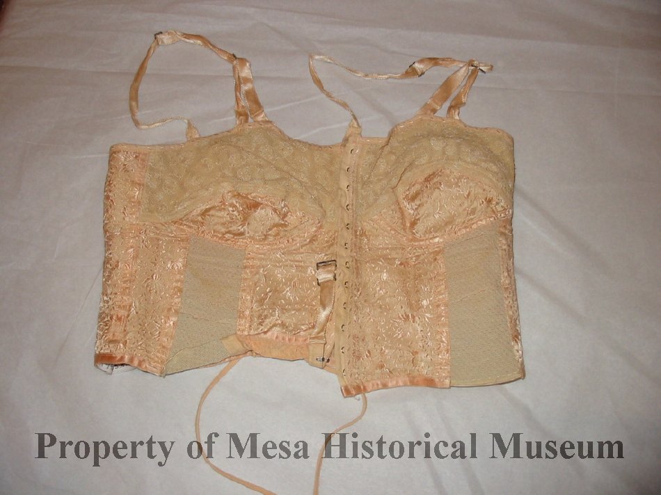 Peach colored brassiere with flowered design.