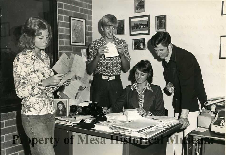 Black and white photo of Juli Stevens, Terry Williams, Leslie Turley, and Chuck Walker addressing the formal invitations for annual Christmas vespers