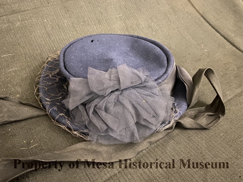Woman's hat- navy blue felt with black band. netting to form a veil on brim. small netting gathered into flower or pom pom attached to hat, hat pin in ribbon has lavender head, black ties also extend from hat to tie under chin.