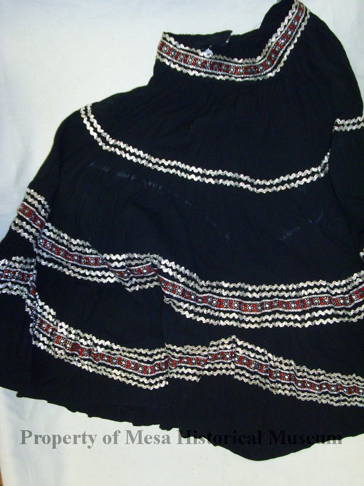 Black skirt decorated with silver ric-rac horizontally around the skirt. Decorations also include silver, red, and white ribbon in conjunction with the silver ric-rac. Waist band decorated with ribbon and silver ric-rac and closed with white button and 7" zipper.