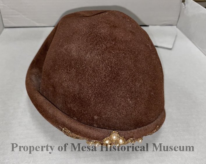 Small brown curved hat. Has beaded design on front. It contains small brown beads, rinestones, & small white pearl type beads. White pearl beads form flowers with rinestones at the center.