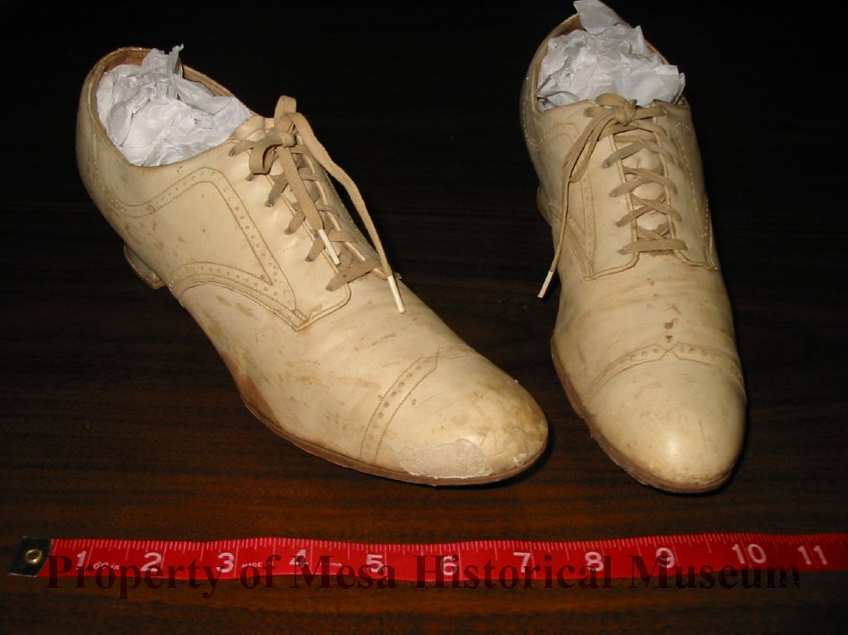 Off white right shoe made of leather. Heel attached with metal screw and small nails. Leather sole stitched at outside edges. Leather inside. Cotton Shoe lace. Saddle shoe look with 1 1/2" heel. Blue label inside with: Arch, Cynthia, shoe.