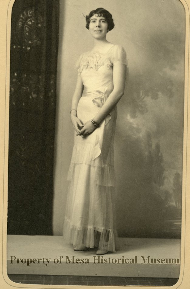 Black and white photo of a Alice O'Barr (Sliger) posing in a studio wearing a long, short-sleeved dress.
