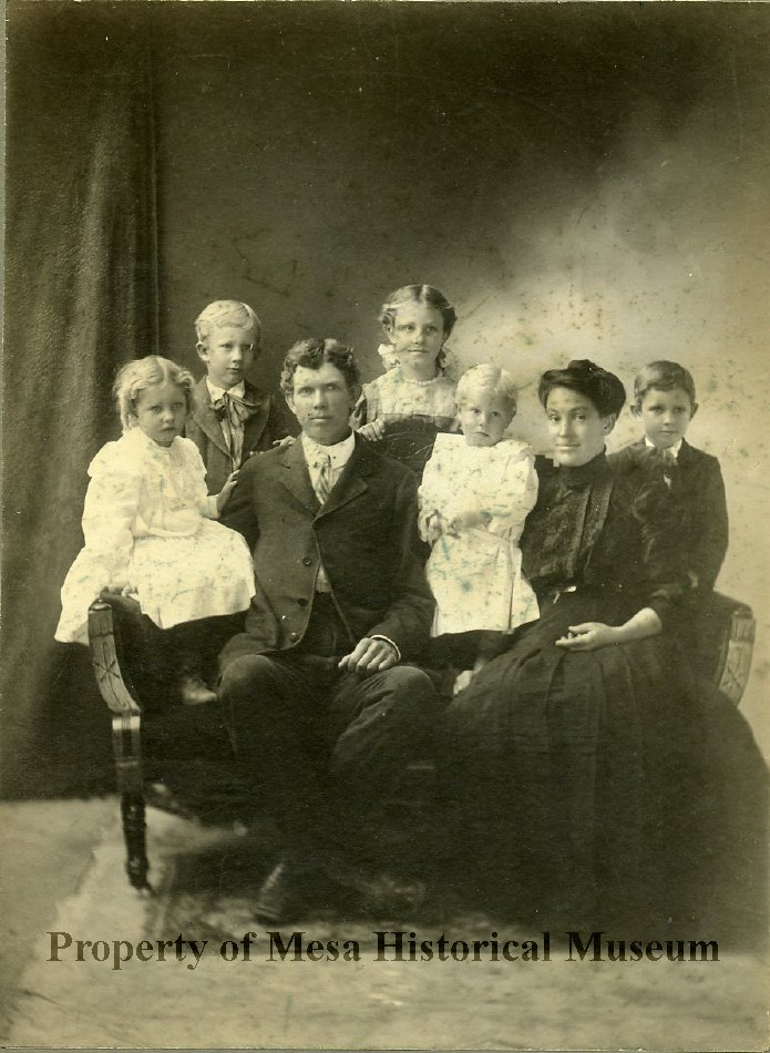 Photo of a man, woman and 5 children. Clothing of late 19th/early 20th century. 3 children standing, man/woman seated on loveseat holding 2 more children.