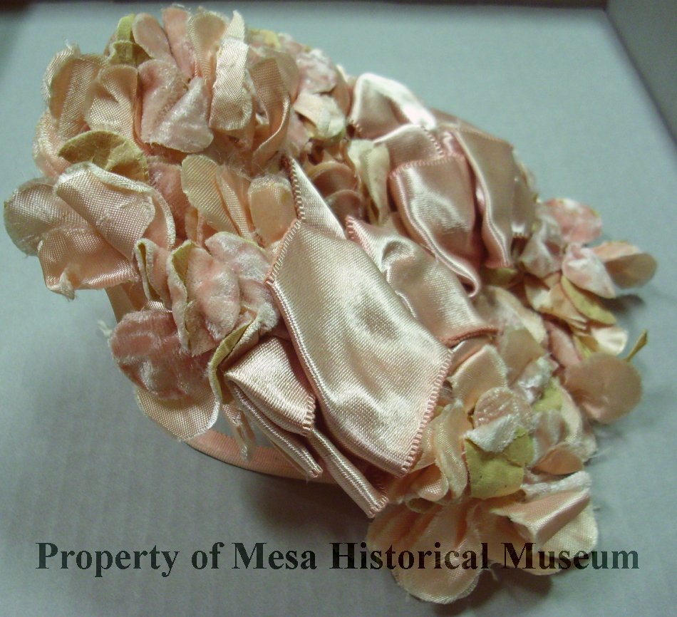 Flat pink hat covered with pink velour flowers and pink satin bows. Hat has pleated piece to fit on head and a stiffened oval in back. Label says: "Holly - Vogue hat Made in California". 8" length.