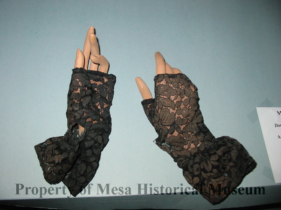 2 black lace gloves, cut-off style fingers, fabric flares out at the wrist.