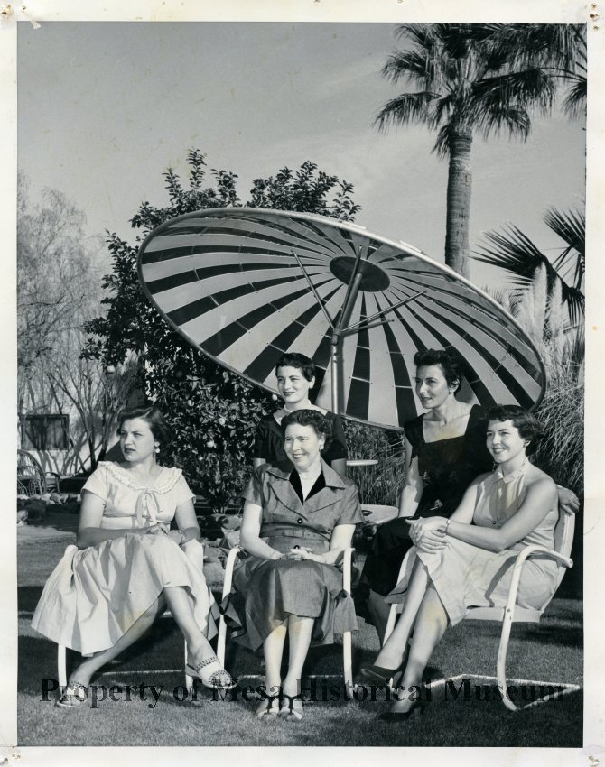 5 ladies relaxing under a large umbrella -Feb. 1956