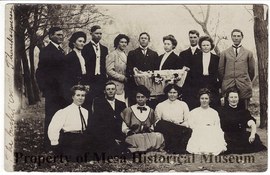 Photo postcard of group of people outside with "The basket crowd - Thanksgiving" inscribed on the front.