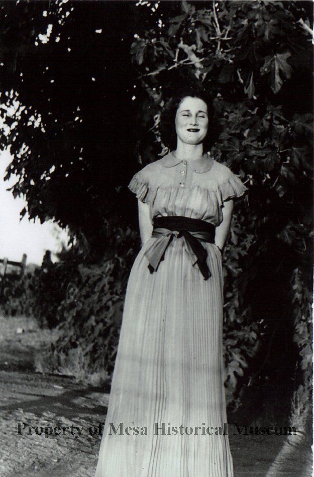 This is a reprint of an original. Printed on August 8, 2007. Gold gown sewn by Romie May Merrill Johnson for her daughter, Gayle. Worn to a Rainbow Girls' Dance at the Phoenix Country Club.