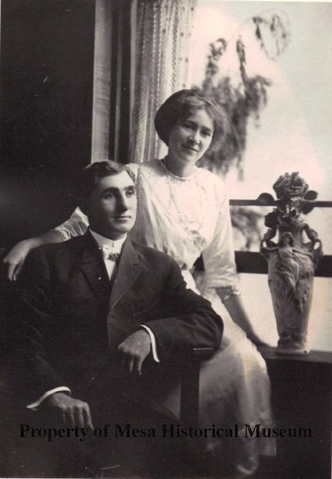 Picture of Amy Dorthy Phelps Morris (1887-1951) and Hyrum Charles Morris (1886-1952) posing in front of a window.